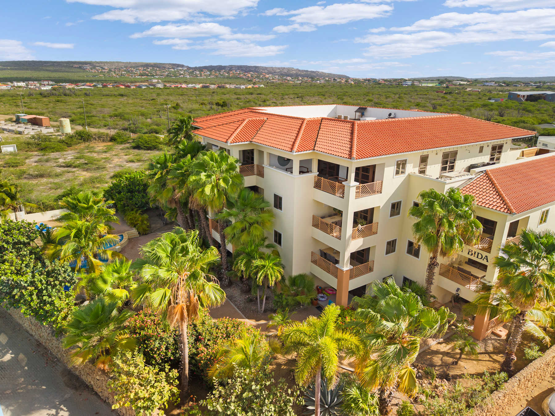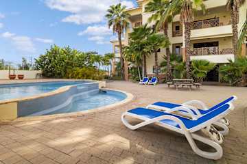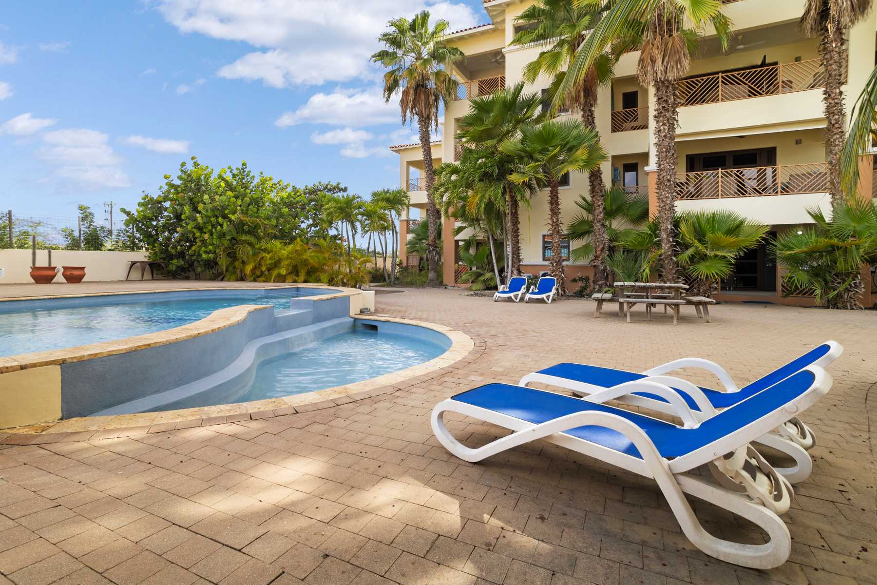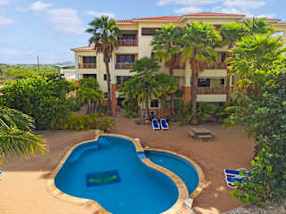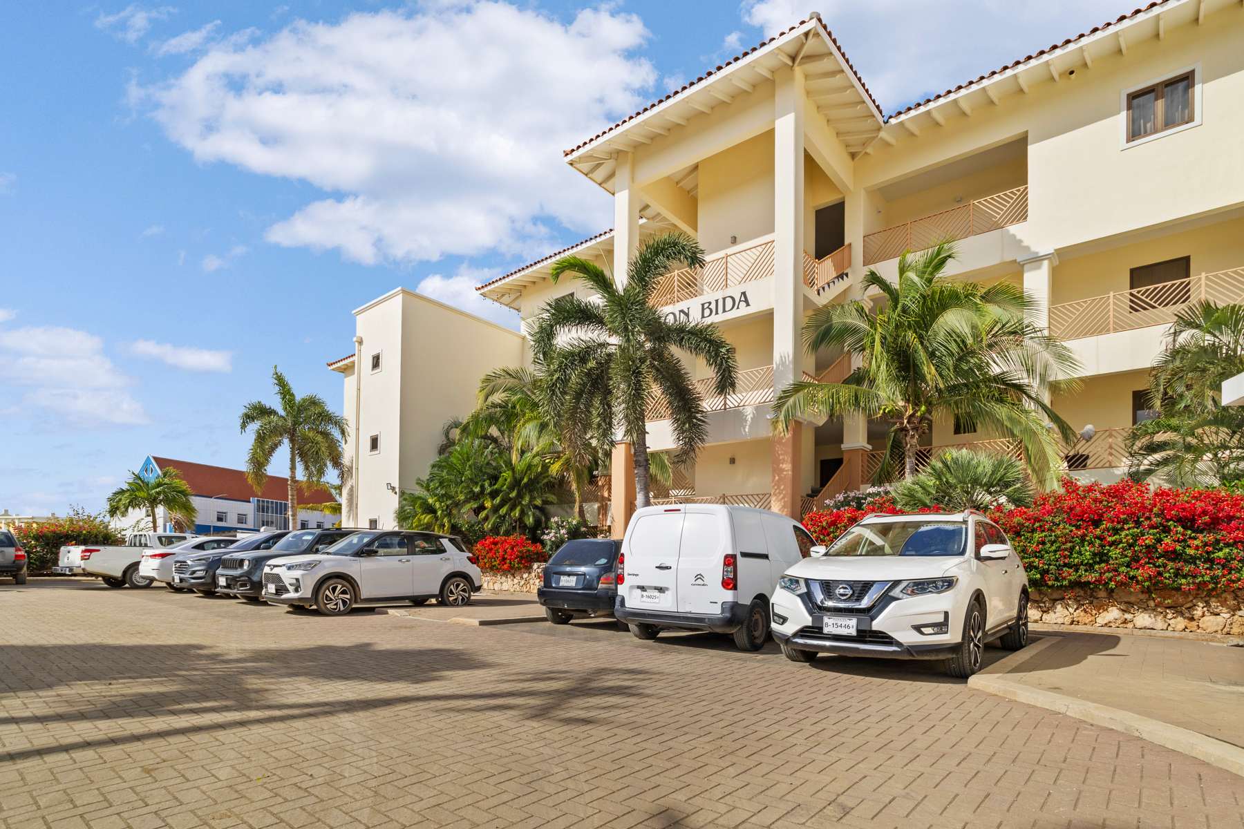 Bon Bida Di Sol is a spacious apartment in the Bon Bida Apartmenten complex in the Hato neighborhood, on what is the second floor in Dutch terms (third floor in the data). The apartment measures 154 m² (approximately 1,658 ft²) and offers views of the green garden and the communal pool. Zhung Kong supermarket is 850 meters away, Isidel Beach Park 350 meters, restaurant Biña at Chogogo 400 meters, and dive center Dive Friends Hamlet 900 meters. Guests have access to the regular shared pool of the complex.