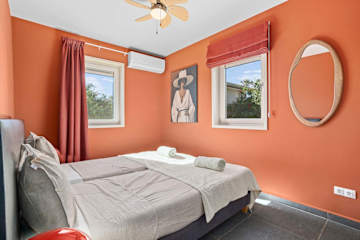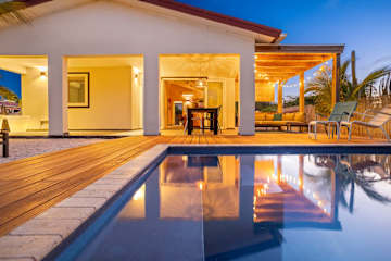 This home features two bedrooms: the master bedroom with two single beds and a second bedroom also with two single beds. There are two bathrooms, adding extra comfort when staying with several people. The open kitchen connects directly to the living room and leads out to the covered porch, terrace, private garden and pool deck. The kitchen is equipped with a dishwasher, refrigerator, freezer, stove, oven, microwave, toaster, blender, coffee maker, kettle, ice maker and all usual cooking essentials for an easy, carefree stay.