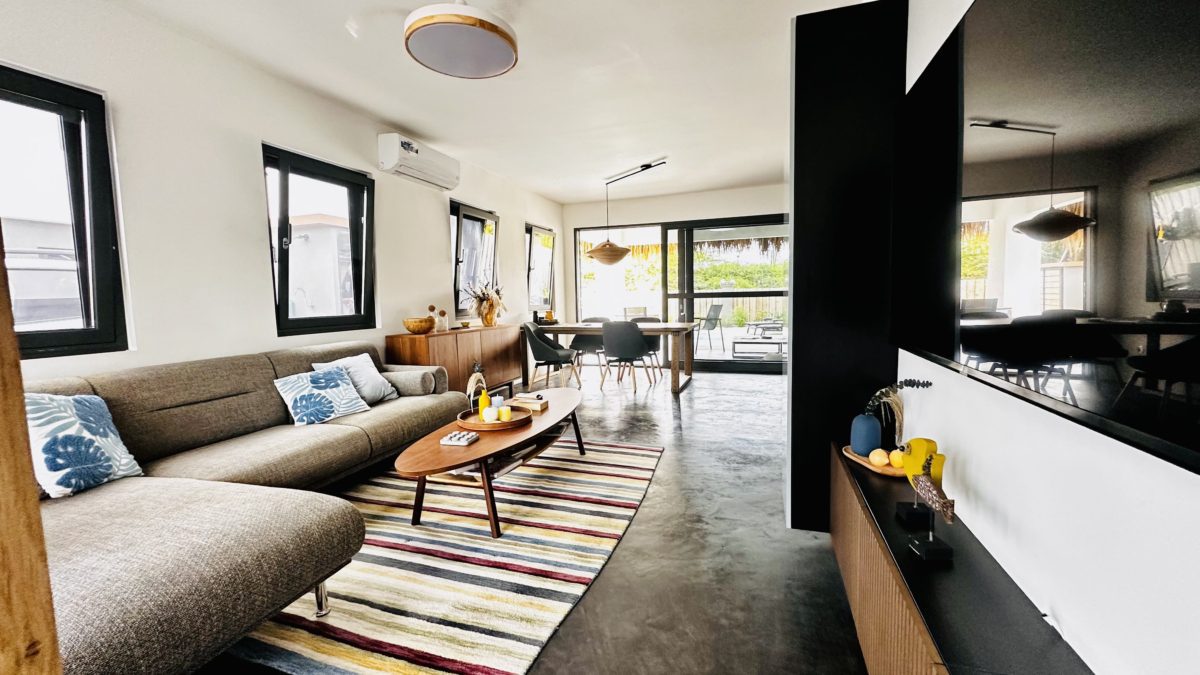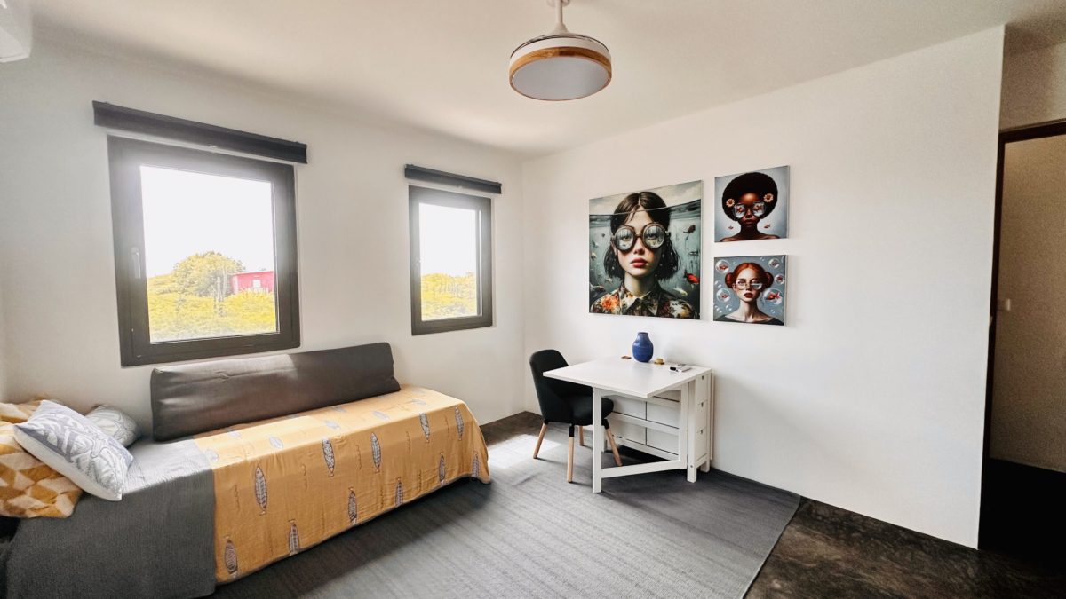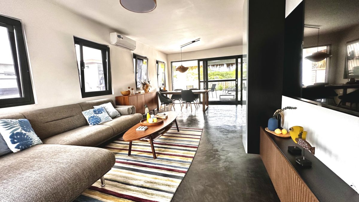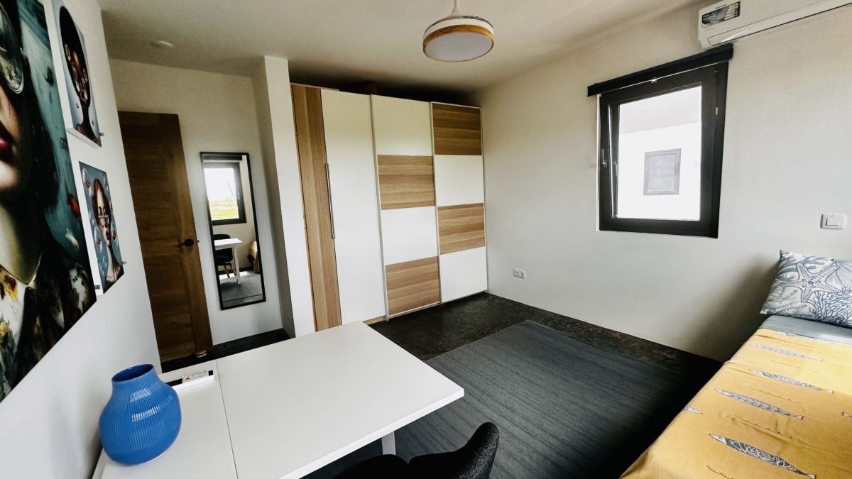 This semi-detached house features two bedrooms and two bathrooms, perfect for a family or professionals needing extra space. The open kitchen connects to the living area and is equipped with various modern appliances such as a dishwasher, refrigerator, induction stove, Nespresso coffee maker, kettle, combi oven, and toaster. The house has a lovely garden with a private pool with a Magna Pool system, where you can enjoy the tropical climate in peace. Parking is free on your own property.