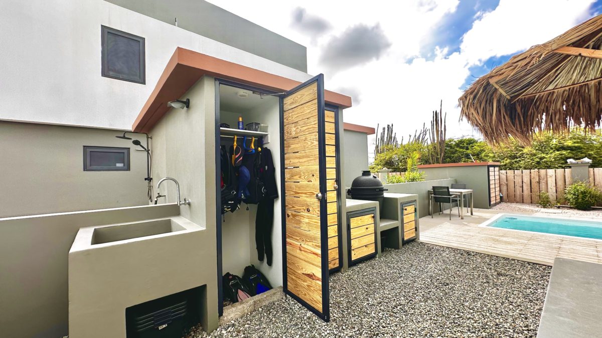 Outdoors, a spacious outdoor kitchen is built, with a pizza oven, barbecue, and rinse tanks for dive gear. There is also a large storage room for extra space. The pump house is constructed entirely in stone, and a generous palapa canopy has been added — perfect for shade and comfort during the warm afternoons.
