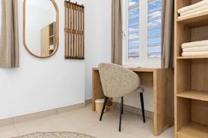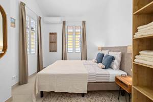 Kas Myrna beschikt over twee slaapkamers, elk met twee comfortabele eenpersoonsbedden van 90 bij 200 centimeter. Er is één badkamer en een apart toilet. De open keuken grenst direct aan de woonkamer en is voorzien van een vaatwasser, koelkast, kookplaat, koffiezetter, vriezer, waterkoker en oven – ideaal voor wie graag zelf kookt. Buiten vind je een veranda en tuin met zitgelegenheid, perfect om te genieten van het uitzicht op het water en de tropische sfeer.
