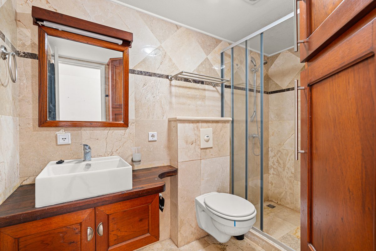 Dit comfortabele appartement van 56 m² ligt aan de Boulevard Gobernador Nicolaas Debrot 41, in Kralendijk, in het gebouw Seaside Apartments. De ligging is ideaal voor huurders die alles dichtbij willen hebben en tegelijk willen genieten van direct zeezicht. De airconditioning in de slaapkamer en woonkamer zorgt voor een aangenaam binnenklimaat, terwijl het balkon en terras extra leefruimte buiten bieden. Dankzij de gemeenschappelijke wasmachine in de gedeelde ruimte en het gemeenschappelijke zwembad is de woning praktisch ingericht voor een langer verblijf.