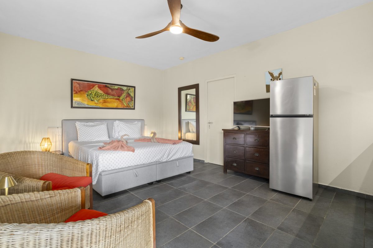 Deze goed ingedeelde studio beschikt over één slaapkamer en één badkamer. De open keuken is volledig uitgerust met een koelkast, fornuis en alle benodigde servies en bestek voor een comfortabel verblijf. De studio heeft een overdekte veranda waar je kunt ontspannen en genieten van de tropische omgeving. Daarnaast is er toegang tot de gezamenlijke tuin en beschik je over gratis parkeren op eigen terrein. Het complex biedt ook een buitenzwembad waar je kunt afkoelen.
