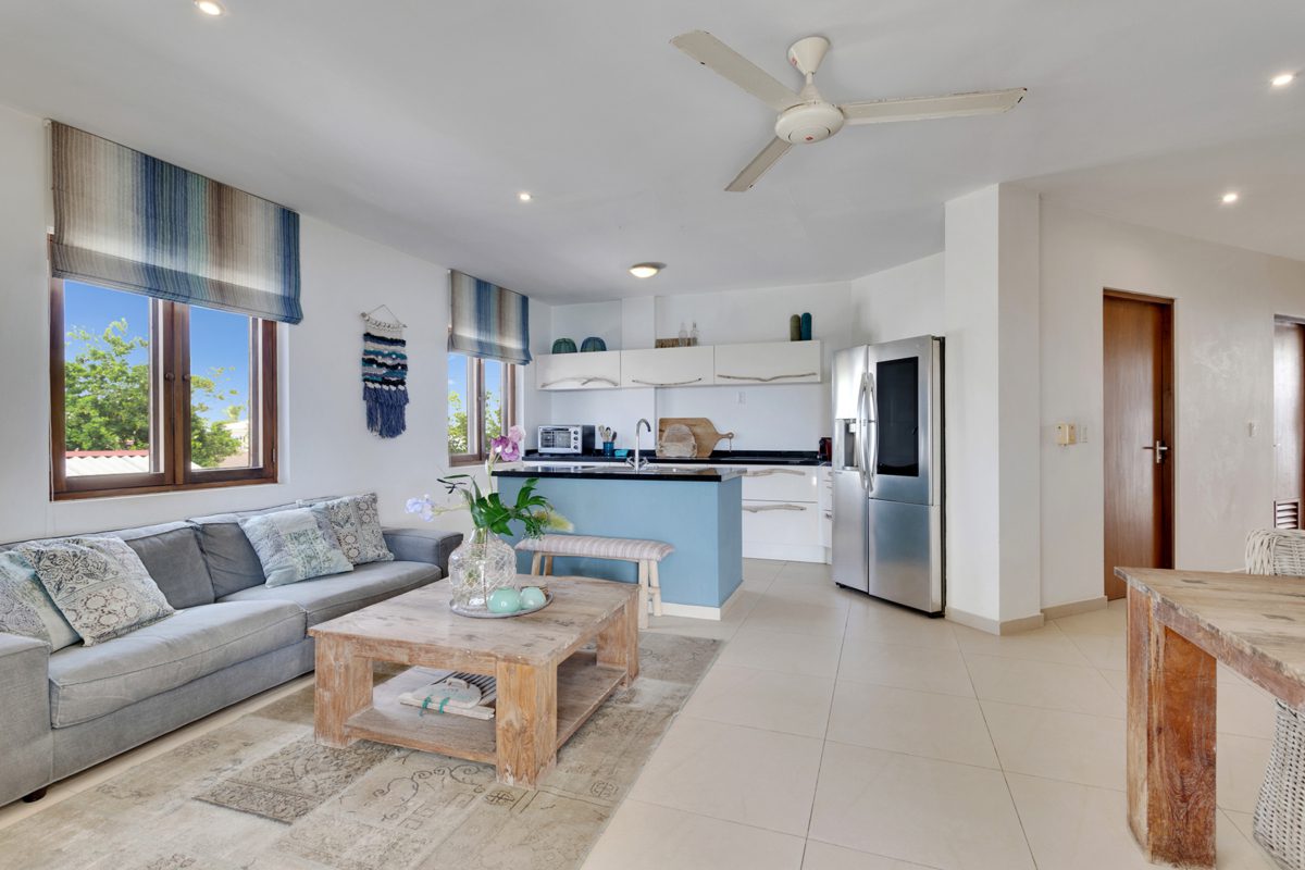 Dit ruime apartment aan de Kaya C.E.B. Hellmund 29 in Kralendijk, in het complex Chachacha Beach Apartments, biedt circa 120 m² woonoppervlak met een spectaculair panoramisch zeezicht. Het op de wind gelegen balkon nodigt uit om na een sportieve dag te genieten van mooie zonsondergangen en het leven buiten. In de slaapkamers zorgt airconditioning voor een aangename nachtrust, terwijl het open karakter van de living en keuken goed aansluit bij een actieve, buitengerichte lifestyle.